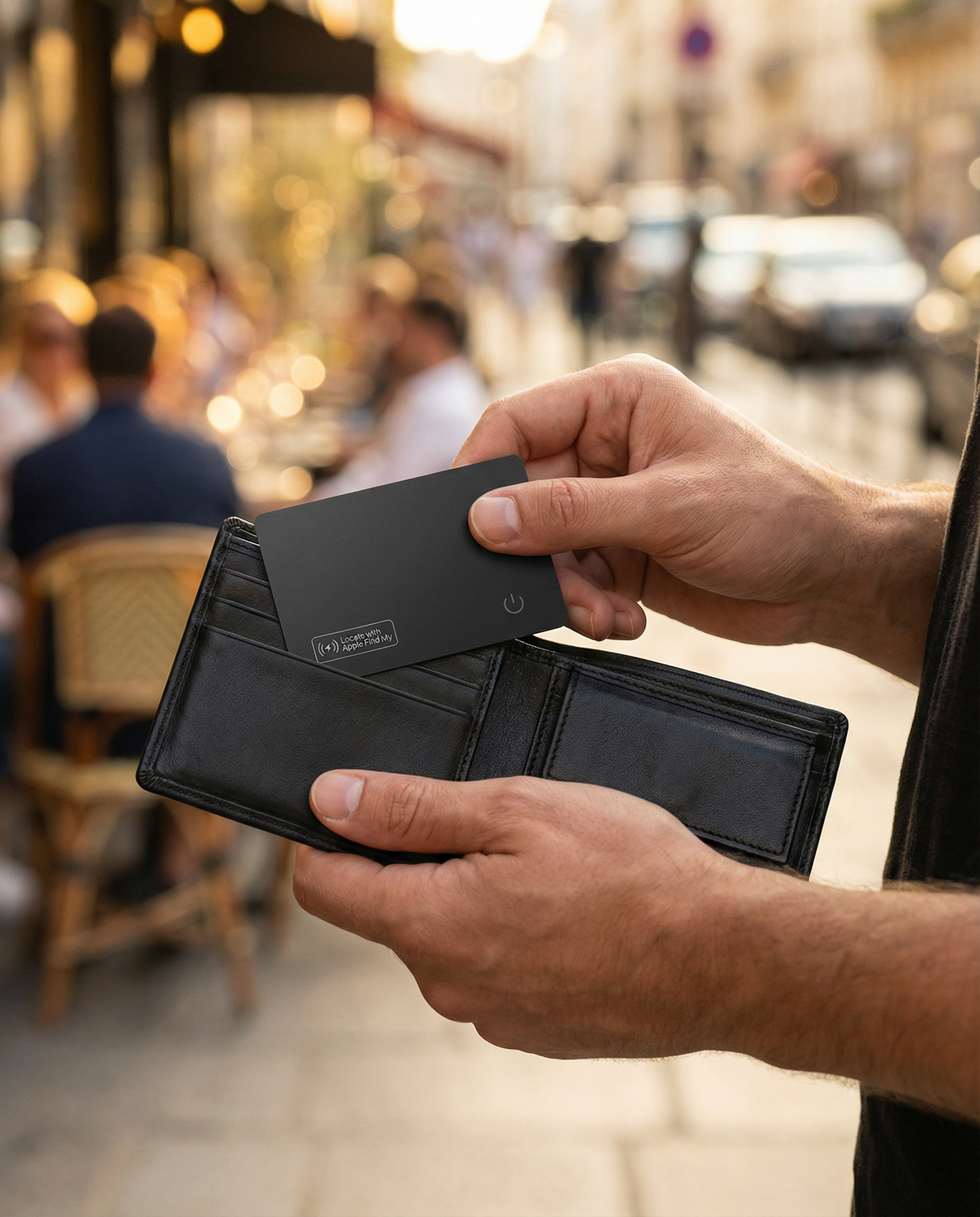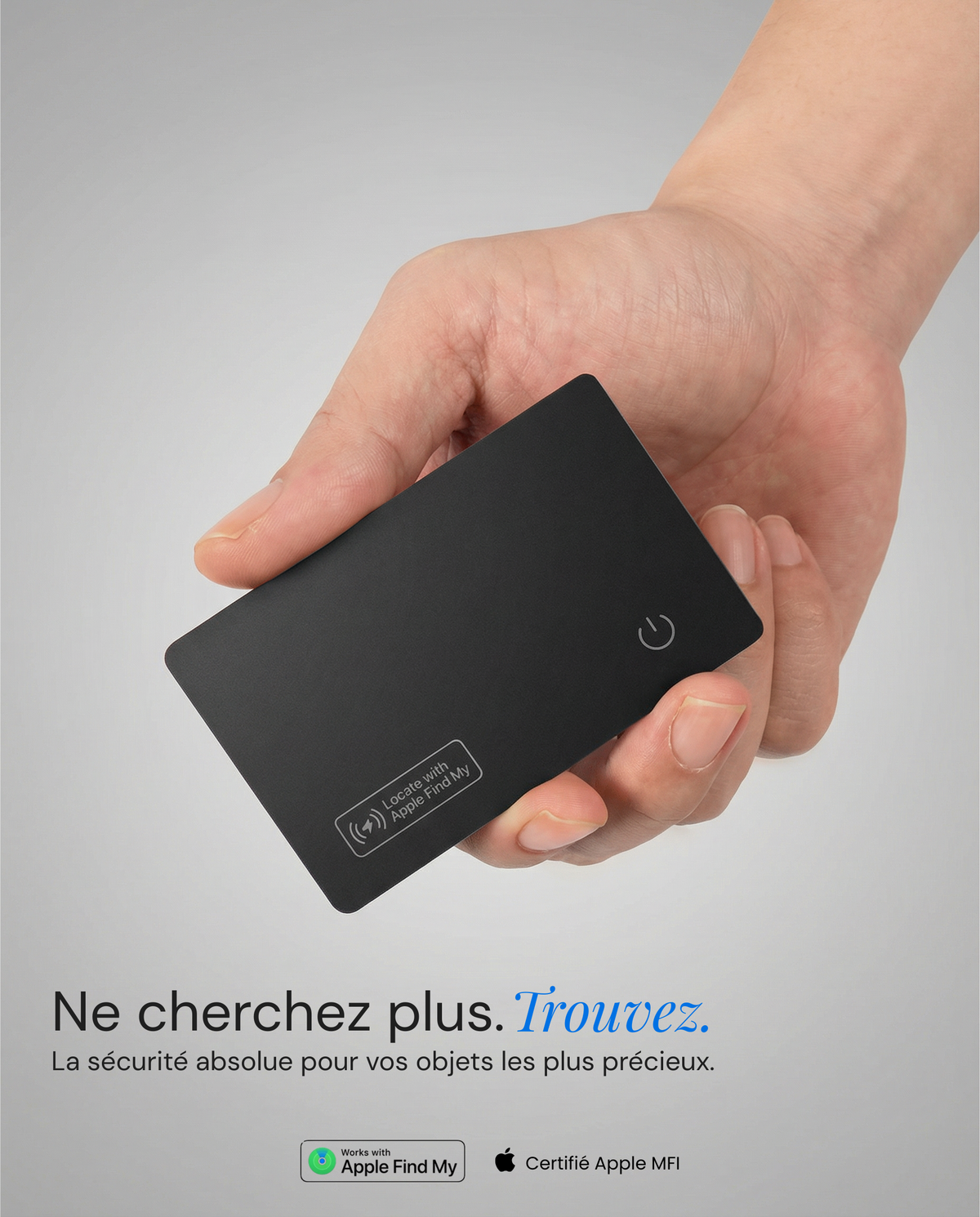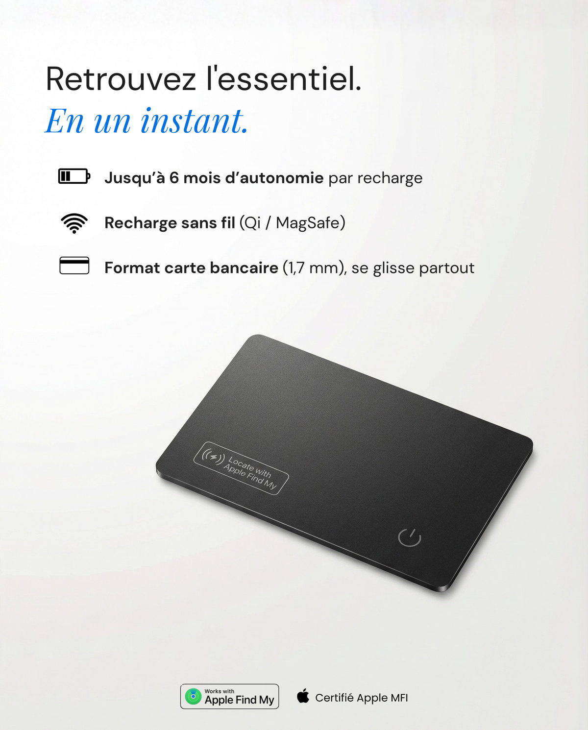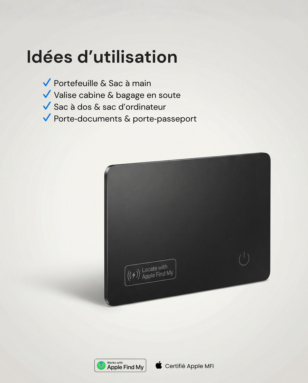 Ultra‑fine, rechargeable et compatible Apple Find My. Glissez-la dans votre portefeuille, valise ou sac, et retrouvez vos affaires en quelques secondes.